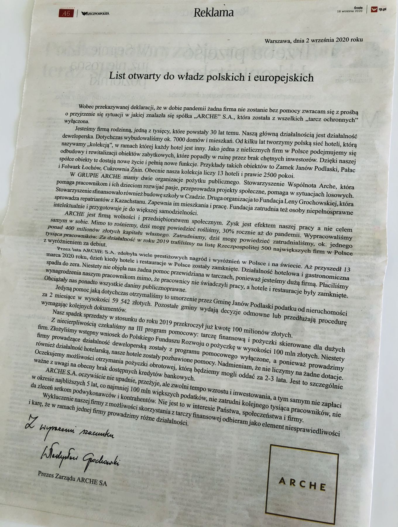Wobec przekazywanej deklaracji, że w dobie pandemii żadna firma nie zostanie bez pomocy zwracam się z prośbą o przyjrzenie się sytuacji w jakiej znalazła się spółka „ARCHE” S.A., która została z wszelkich „tarcz ochronnych” wyłączona.